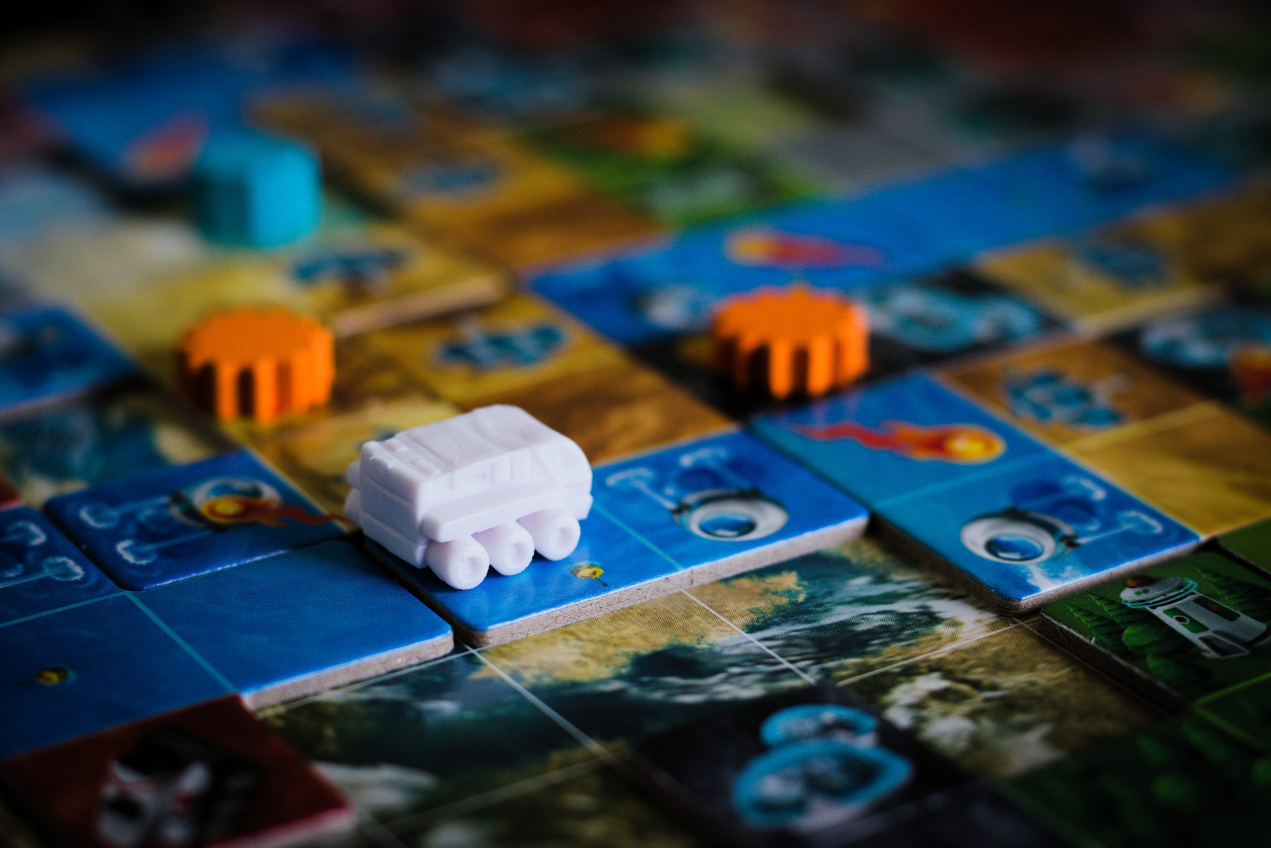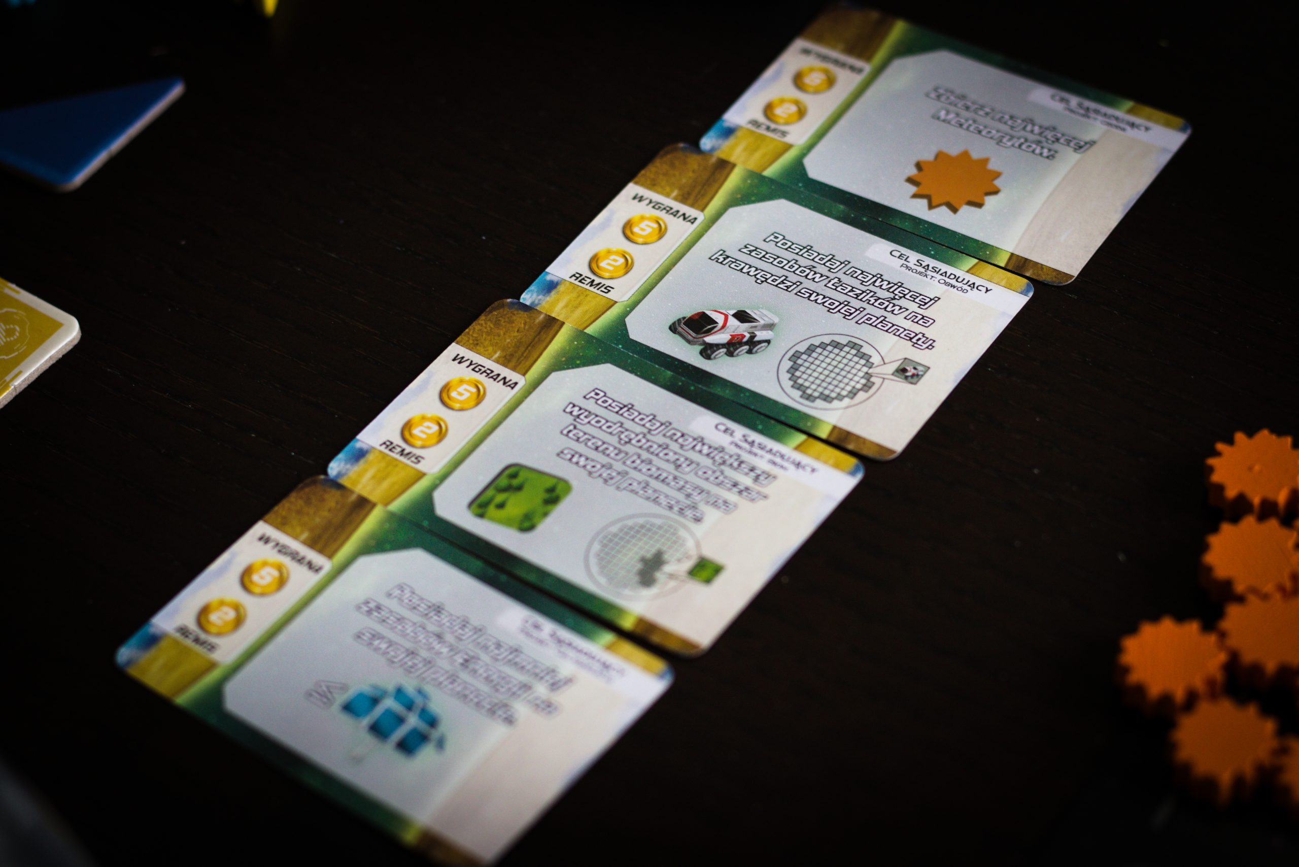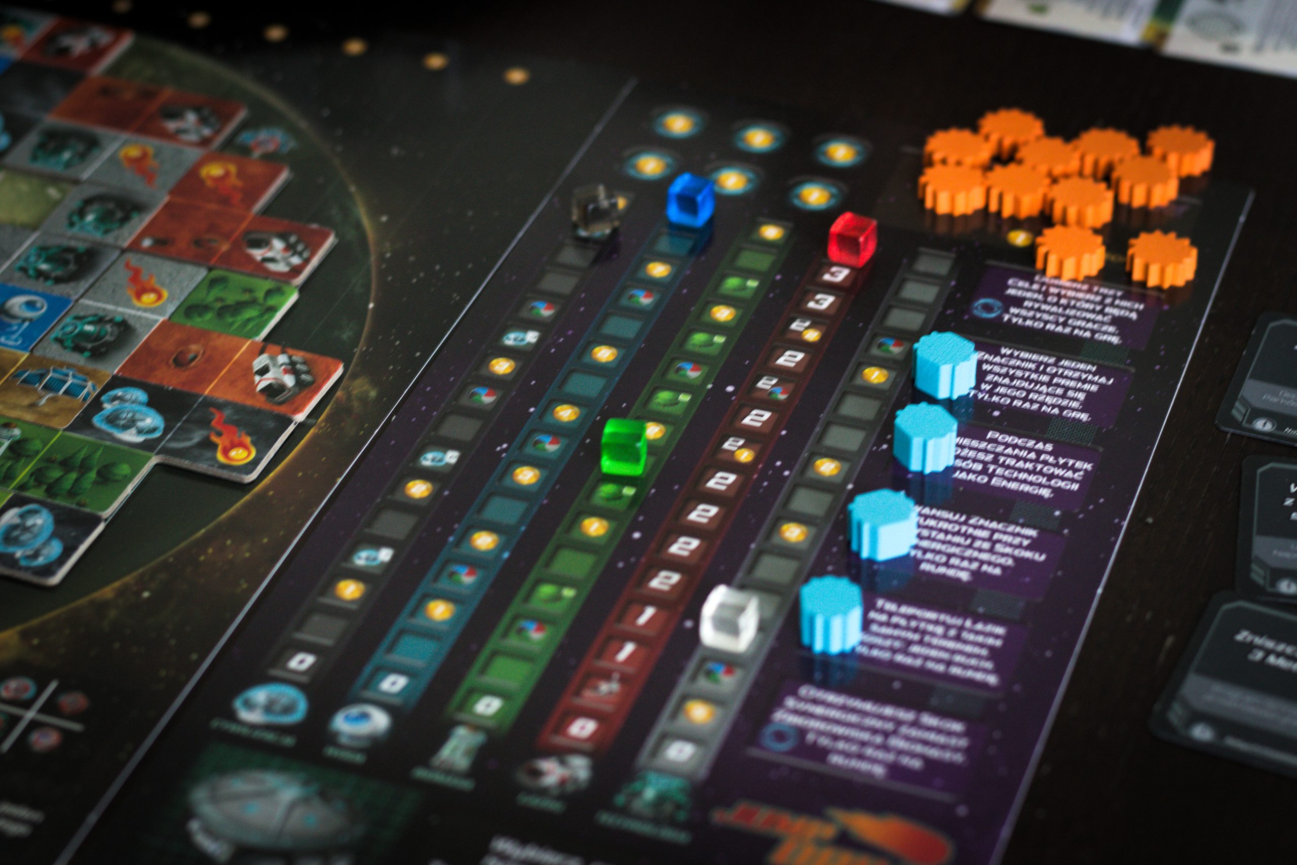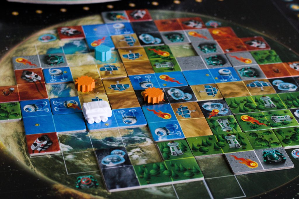 Przed sobą mamy planszę własnej planety, do której dokładamy różnokształtne kafelki dobierane z centralnego magazynu. To w sumie tyle jeżeli chodzi o mechanikę. Cała reszta rozgrywki to podnoszenie wskaźników na torach 5 zasobów, w zależności od typu terenu położonego na mapę. Każdy z torów umożliwia zdobywanie punktów, bonusów, ulepszeń, a nawet jeżdżenie po planecie własnymi łazikami – to sprawia największą frajdę 😃 Koniec końców chodzi o wypełnienie jak największej ilości rzędów i kolumn w naszej siatce na planszy i ukończenie celów określonych na starcie.