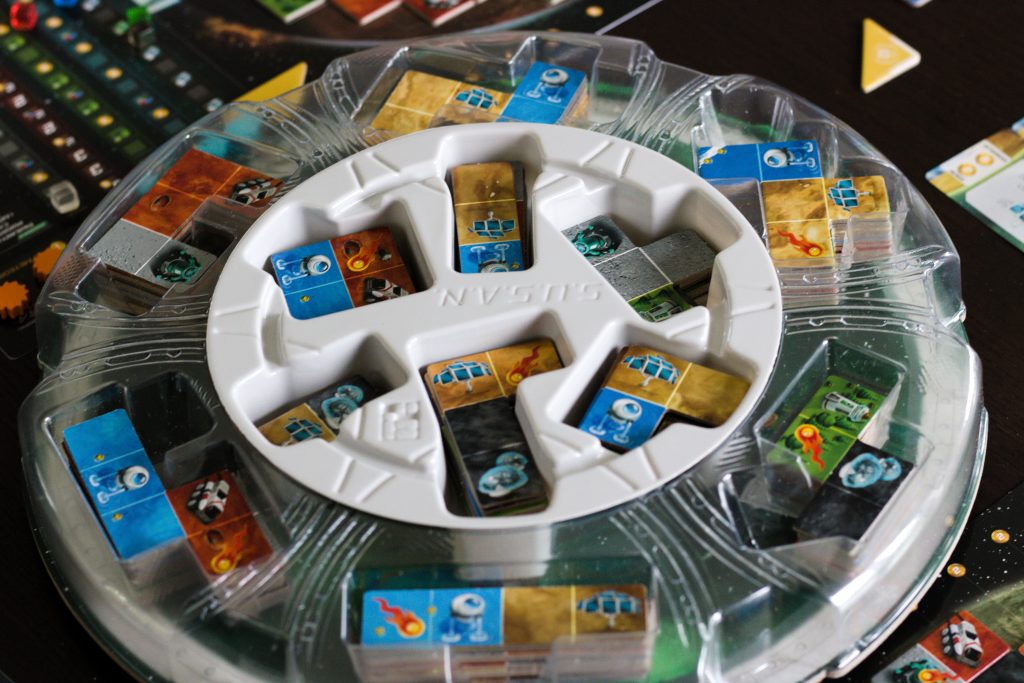 Sercem gry jest świetnie przemyślany, obrotowy podajnik na kafelki. Ustawia on każdemu z graczy odpowiedni magazyn do pobrania płytek, dzięki czemu rozgrywka przebiega symultanicznie. Problem zaczyna się dopiero przy sprzątaniu gry – trzeba się sporo namęczyć, by wcisnąć podajnik z powrotem do pudełka – jest o te kilka milimetrów za szeroki i rozpycha kartonowe ścianki. Dodatkowo, przy przechowywaniu pudełka w pionie, wszystkie misternie poukładane kafelki wysypują się ze swoich przegródek ☹️ Może to my robimy coś nieumiejętnie? Za tę drobną niedogodność, od nas mały minus.