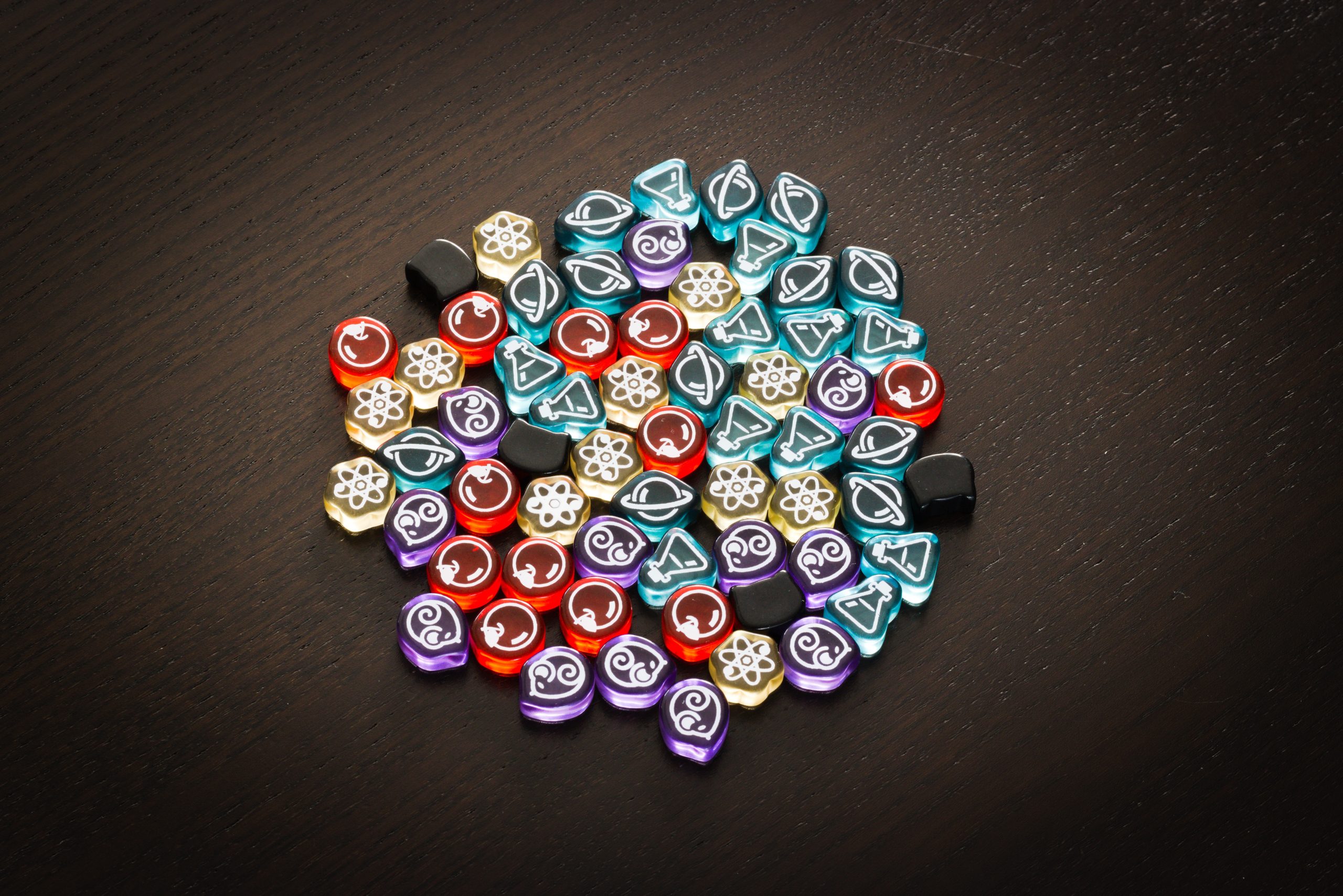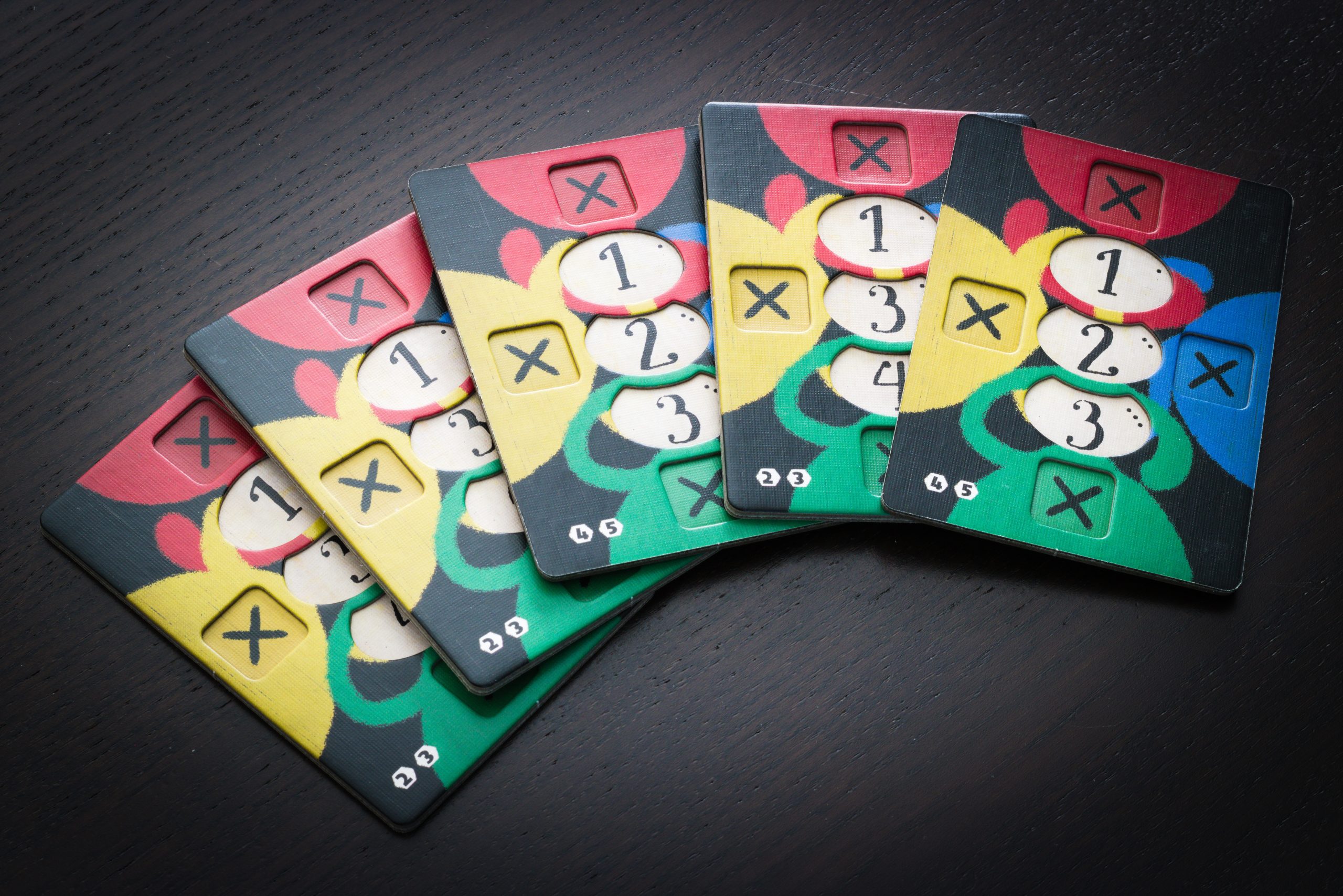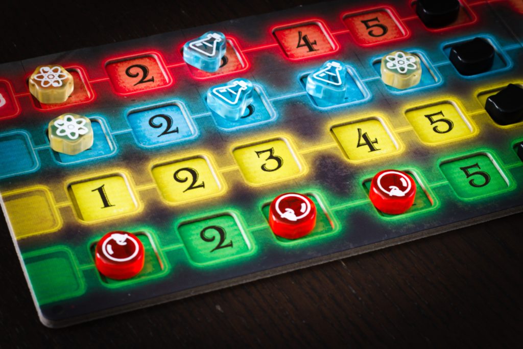 Komponenty w grze są ładne, od klimatycznych kart, przez dwuwarstwowe planszetki, po urocze znaczniki graczy. Do tych ostatnich jedna uwaga – “dropsy” co prawda różnią się kształtem i ikoną, ale dwa z kolorów są prawie identyczne.