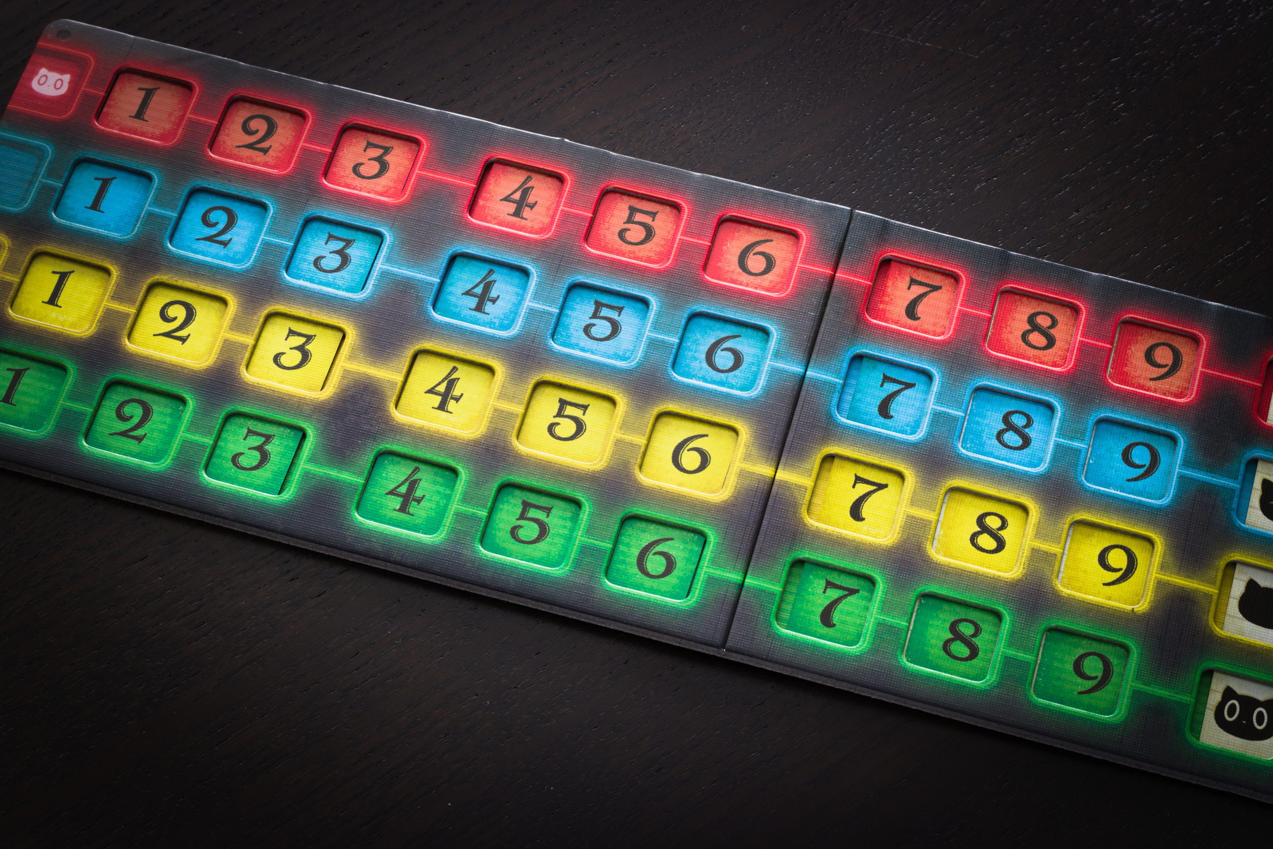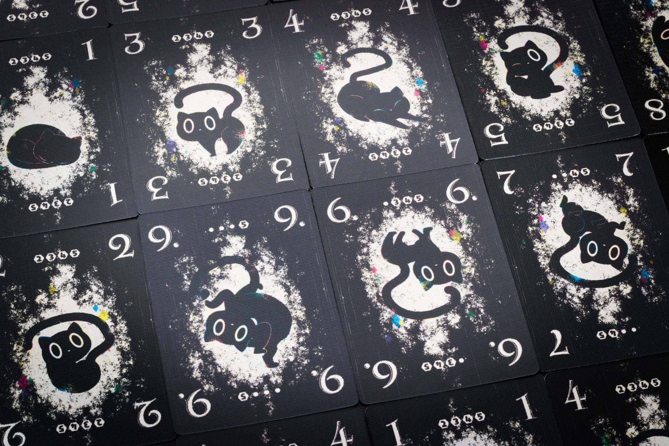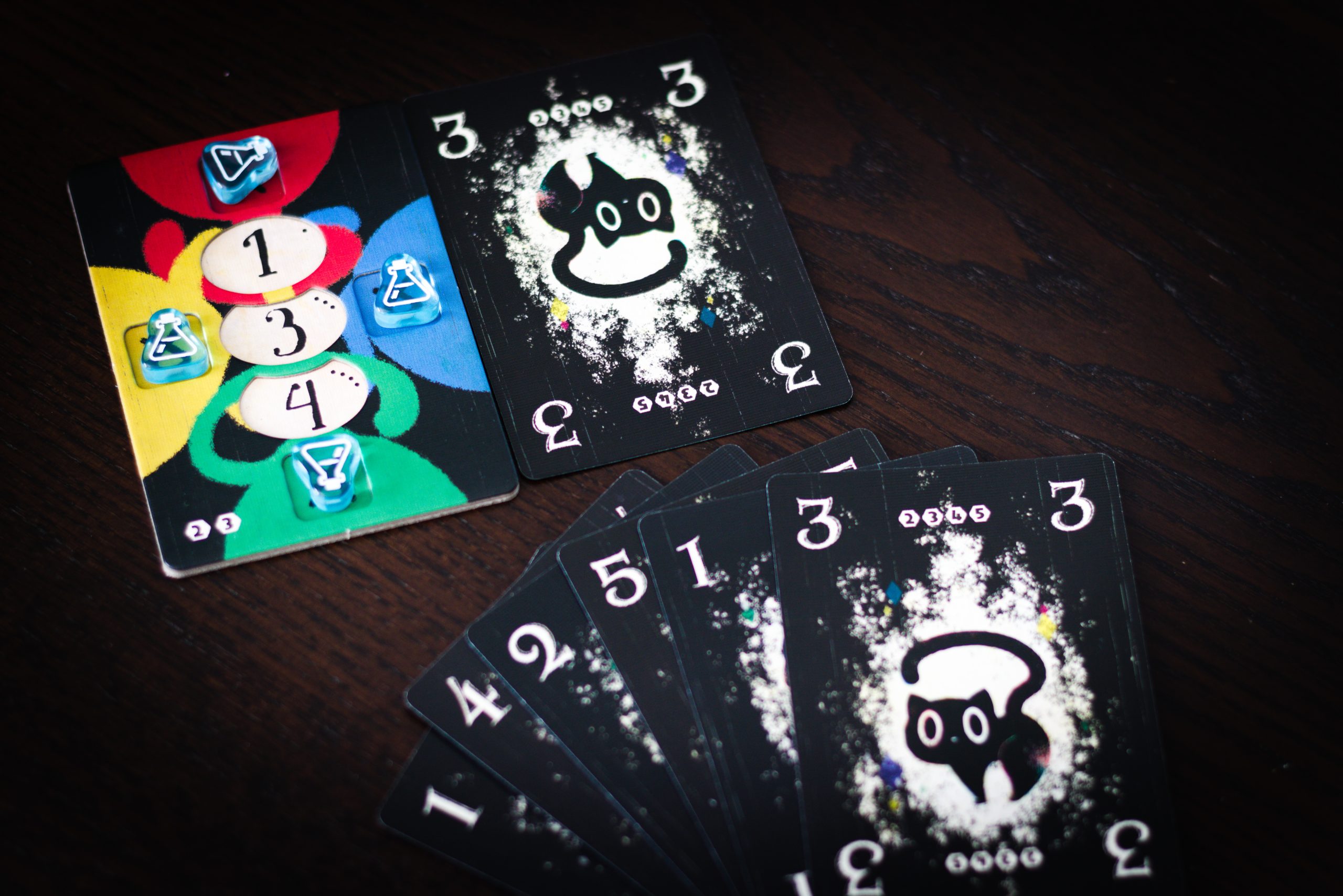 Wszystkie ponumerowane koty są czarne. Do czasu, kiedy je wykładamy i wtedy sami decydujemy jaki to kolor, zaznaczając na specjalnym torze deklarowaną kartę. Lewę zgarnia największa karta lub czerwony kolor atutowy.