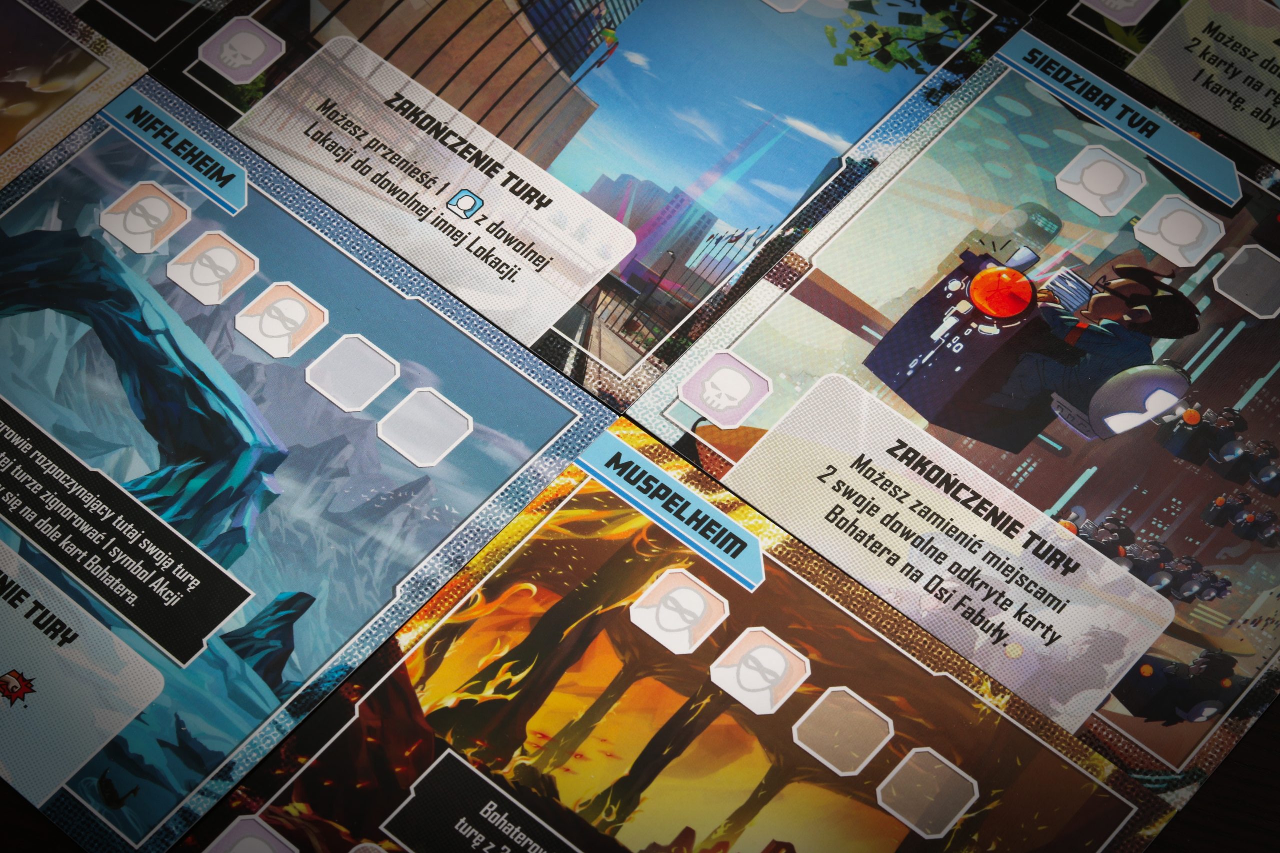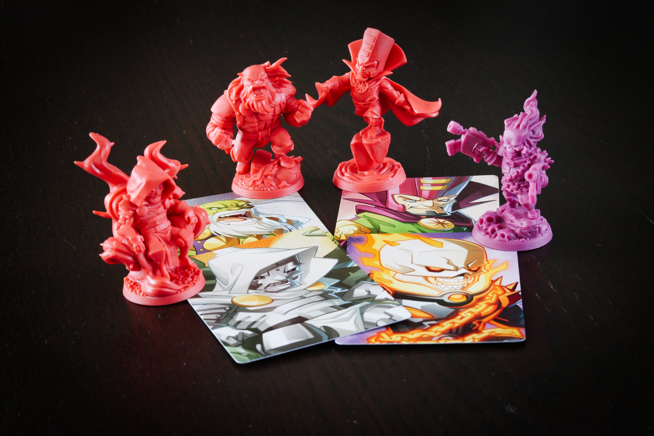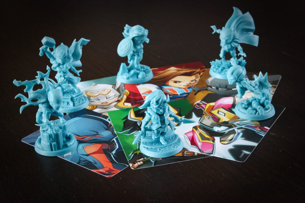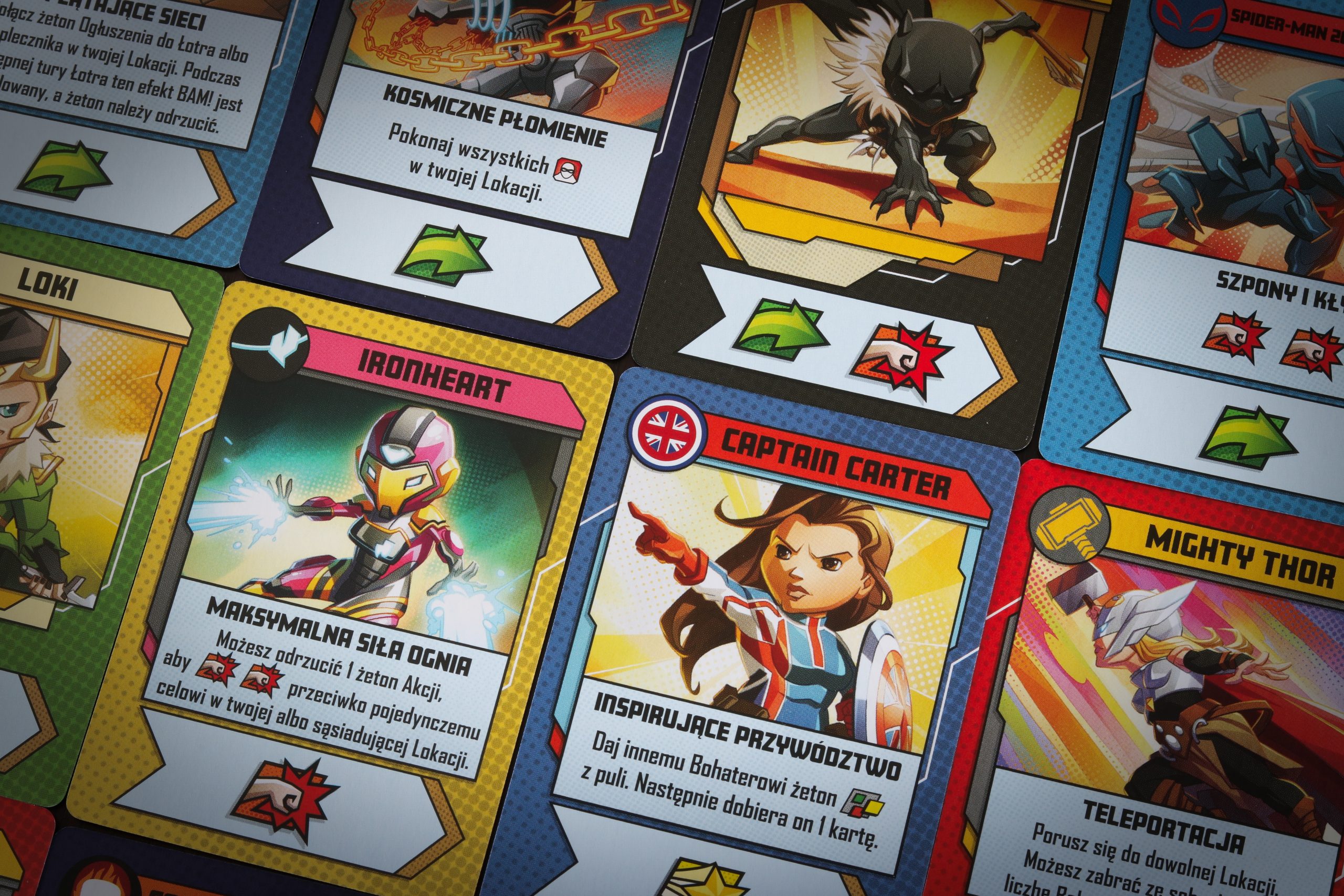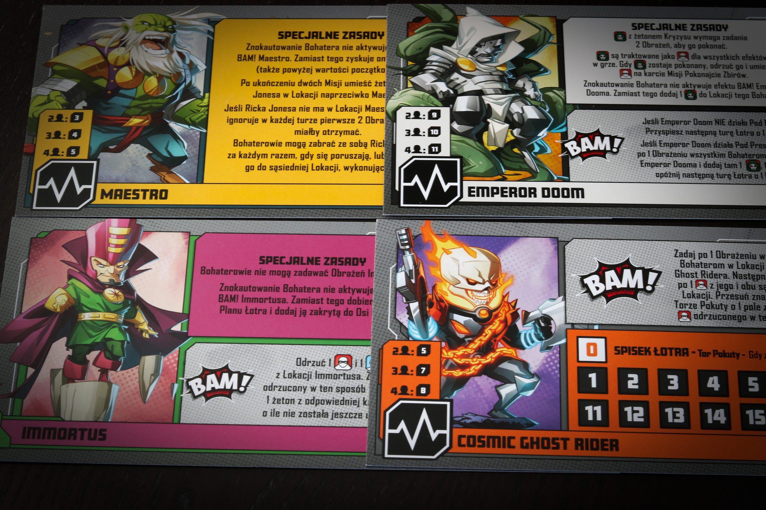 Ten, który mamy w rękach – Multiverse, jest samodzielną grą, czyli można od niej zacząć zabawę (chociaż przez mnogość zasad polecamy ją raczej dla ogranych graczy). Wpadamy w multiświat złożony z 6 superbohaterów – mniej znanych, jak Peggy Carter, Mighty Thor czy Ironheart (dziewczyny górą!), ale też wersje już istniejących jak Loki. Naprzeciwko mamy 3 łotrów oraz jednego niezdecydowanego (Cosmic Ghost Rider – wymiata!), który może stanąć po dowolnej ze stron.