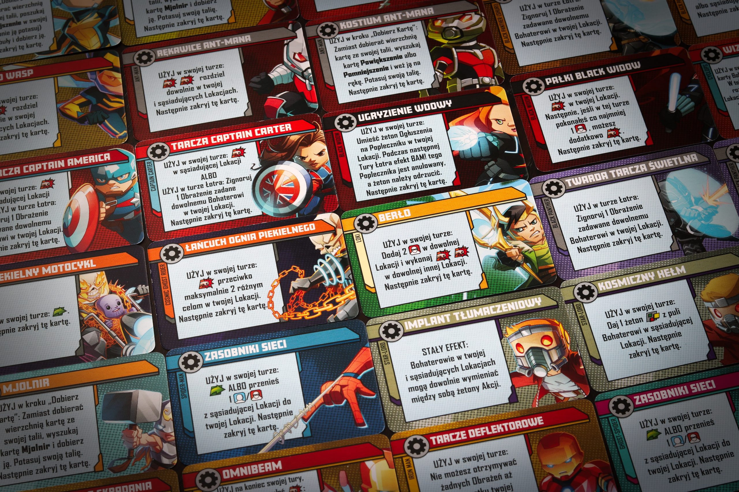 Oprócz podstawowych elementów gry, trybów Arcyłotra i solo, dostajemy dodatkowe żetony używane przez poszczególnych wrogów, a bohaterowie mogą korzystać z własnych kart ekwipunku. Świetne jest to, że talia tych kart zawiera również sprzęt innych postaci z już wydanych zestawów, więc jeżeli je posiadamy, możemy wreszcie grając np. Kapitanem Ameryką wyposażyć go w tarczę! Chociaż szkoda, że takiej talii nie można kupić jako osobnego dodatku.