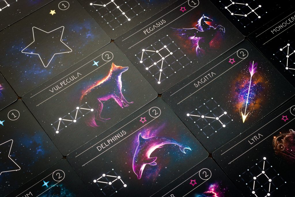 Punkty dostajemy za włączenie do konstelacji gwiazd o typie określonym na obecnej oraz poprzedniej karcie zadania, a także za każde połączenie między tymi typami. Na koniec gry dodajemy jeszcze punkty za połączenia przecinające eklektykę (linię na środku tarczy), gwiazdy zakreślone obok słońca oraz na brzegach planszy. Niebo jest ciasne i nie zawsze da się na nim umieścić pełne wzory – każda wygasająca, czyli pominięta przez nas gwiazda, to 3 punkty ujemne.