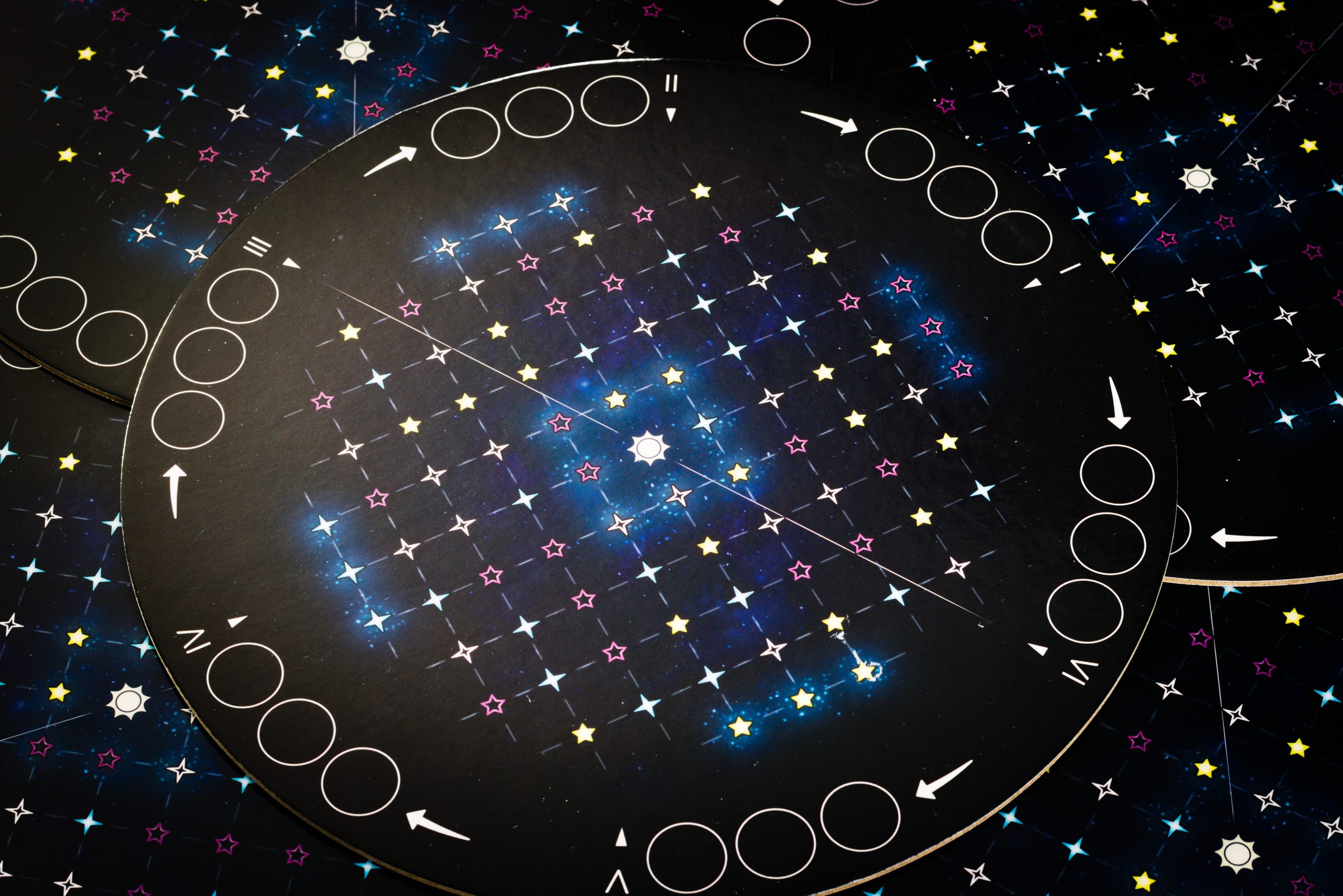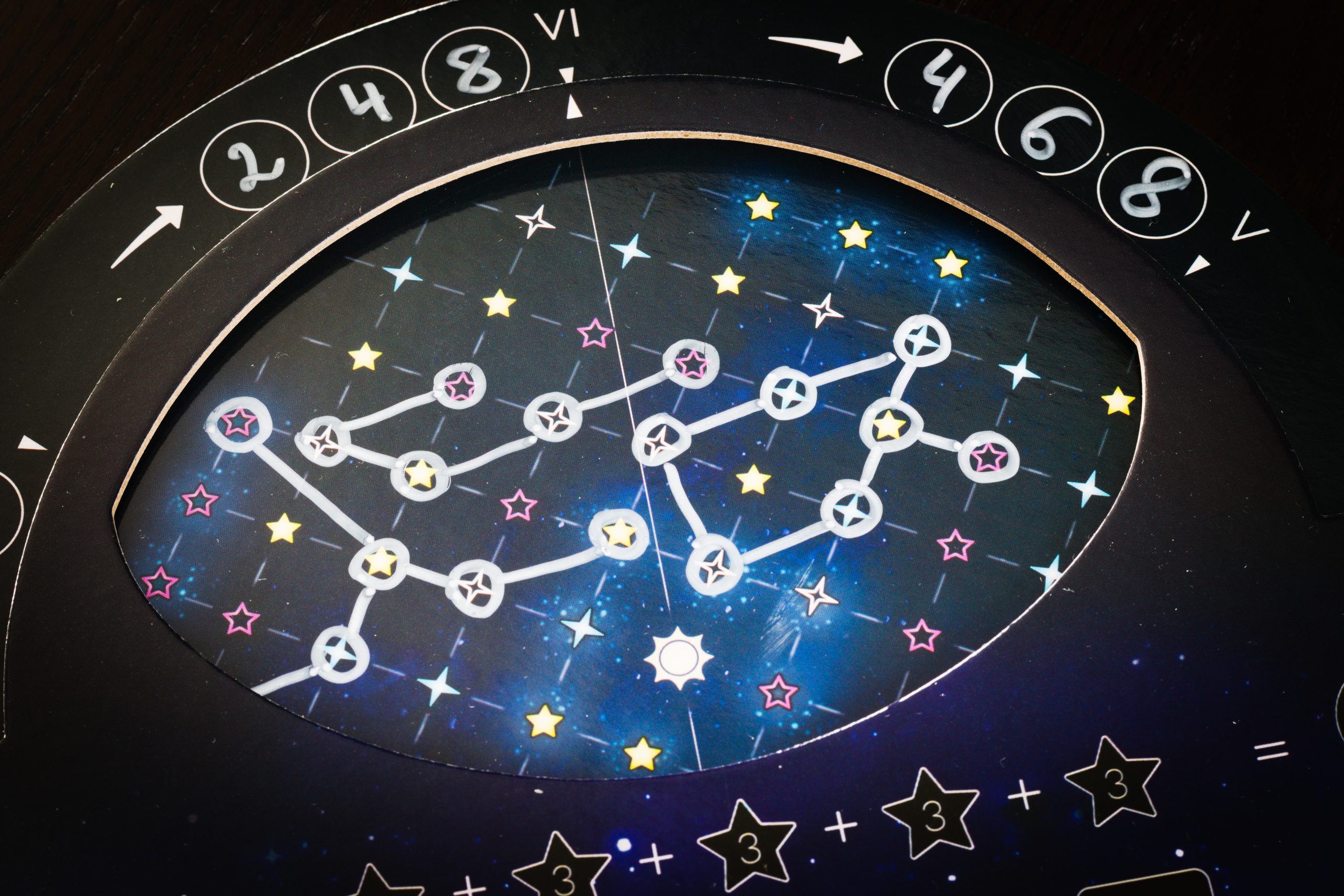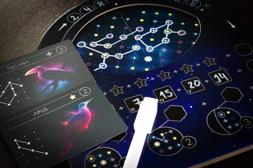 Pierwsze co rzuca się w oczy to obrotowe tarcze nieba, symulujące poruszający się nieboskłon. To nie jest niepotrzebny bajer, ale sprytnie zaprojektowana plansza sterująca mechaniką gry. W każdej z 6 rund umieszczamy jedną konstelację na widocznej części nieba, liczymy ile punktów nam przyniesie i przekręcamy tarczę o 60 stopni odsłaniając następną przestrzeń do wypełnienia.