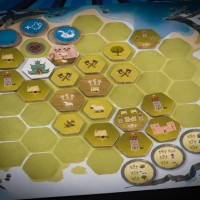 Tytułowe Łupy to kafelki zbierane z planszy głównej, po które wysyłamy naszych robotników-wojowników. To co uda się złapać dokładamy na własną planszetkę, starając się spełnić warunki sąsiedztwa dla innych, punktujących, kafli budowli i drakkarów. A dzięki odpowiedniemu rozlokowaniu swoich pionków dookoła płytek budynków, możemy je zgarnąć razem z drewnem czy owcą. Wszystko co ułożyliśmy w swojej wiosce na koniec przynosi punkty, które możemy dodatkowo pomnożyć otaczając drakkary wymaganymi towarami.