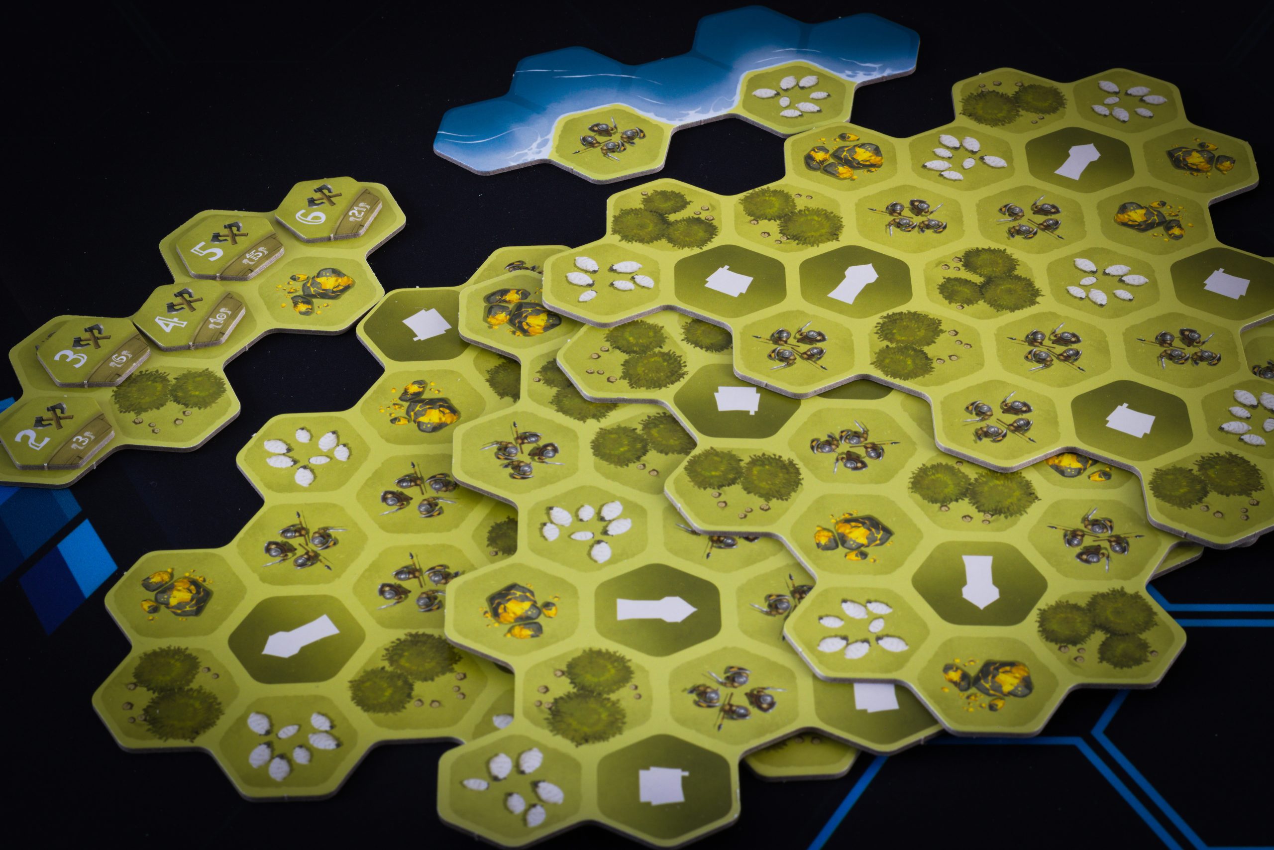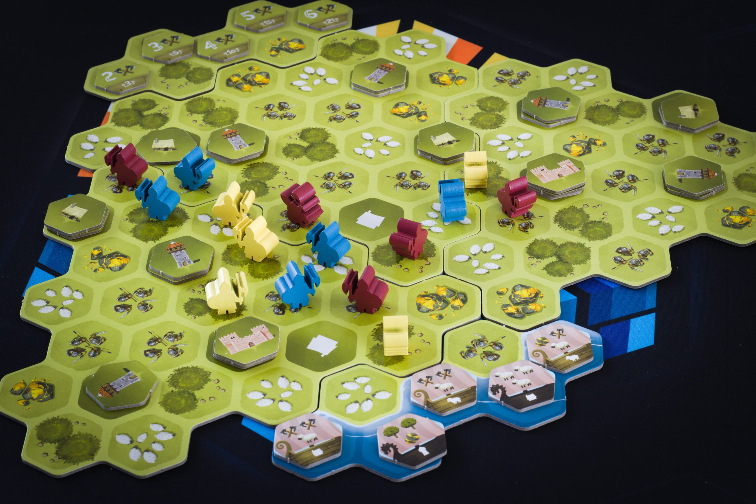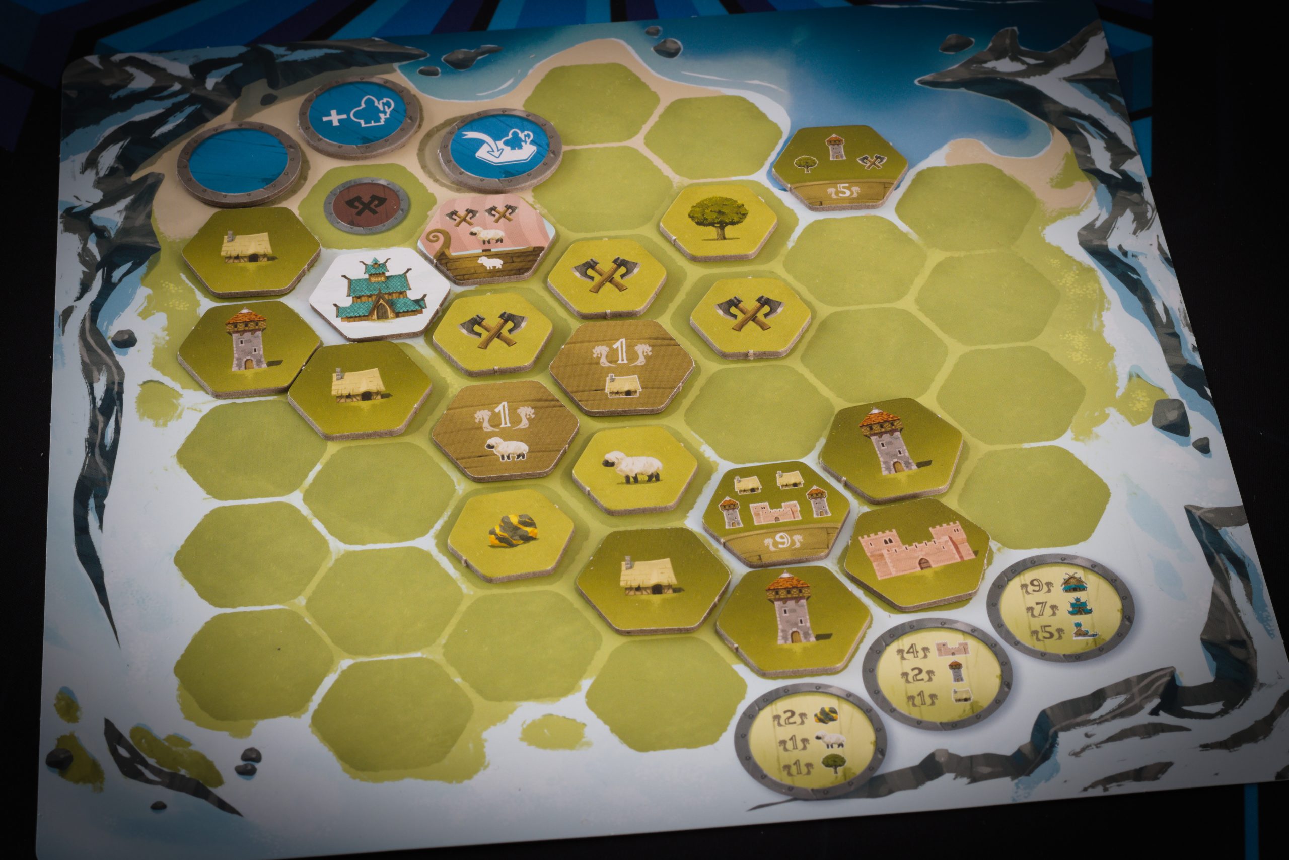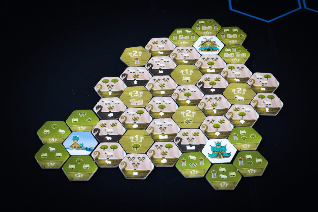 Tytułowe Łupy to kafelki zbierane z planszy głównej, po które wysyłamy naszych robotników-wojowników. To co uda się złapać dokładamy na własną planszetkę, starając się spełnić warunki sąsiedztwa dla innych, punktujących, kafli budowli i drakkarów. A dzięki odpowiedniemu rozlokowaniu swoich pionków dookoła płytek budynków, możemy je zgarnąć razem z drewnem czy owcą. Wszystko co ułożyliśmy w swojej wiosce na koniec przynosi punkty, które możemy dodatkowo pomnożyć otaczając drakkary wymaganymi towarami.