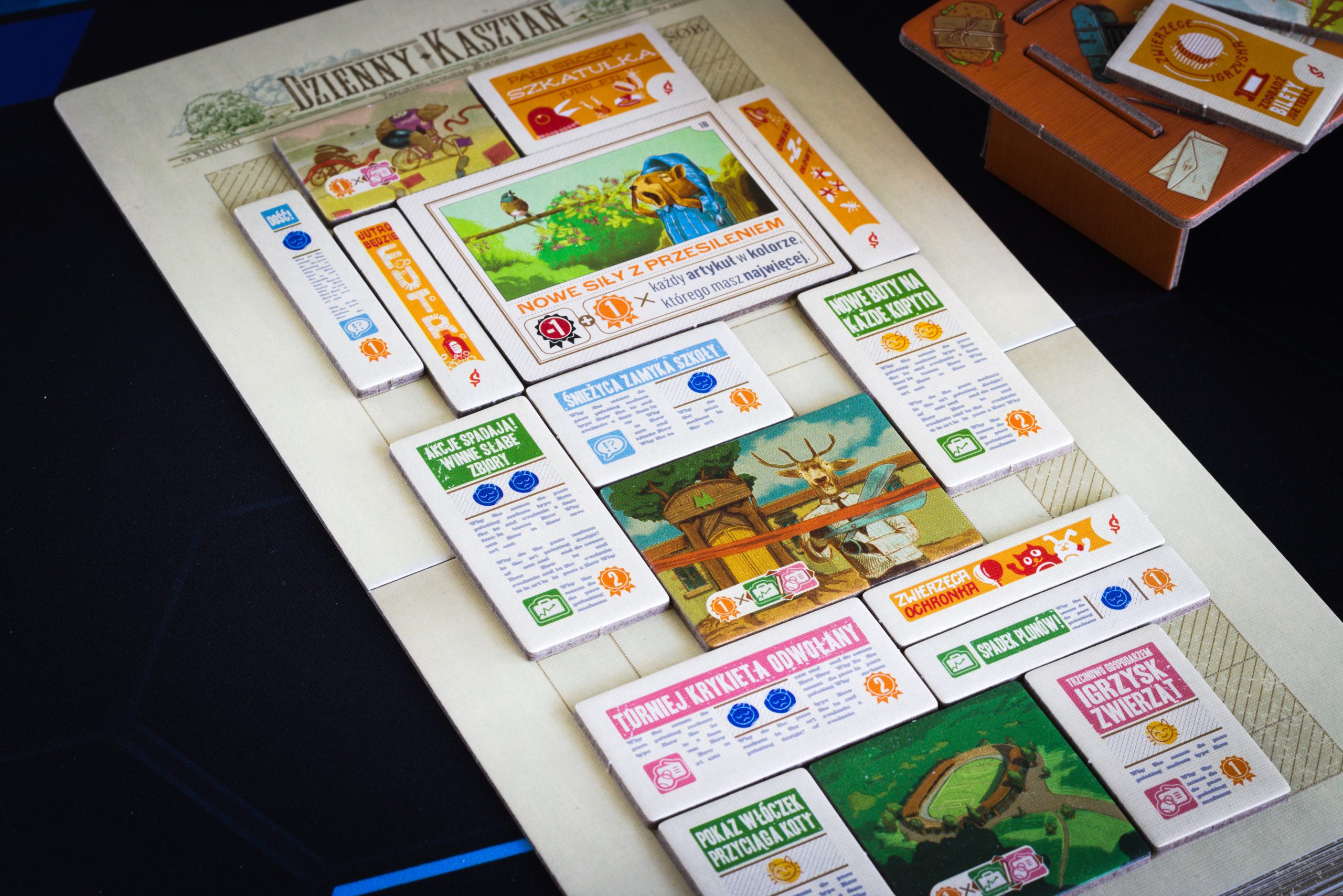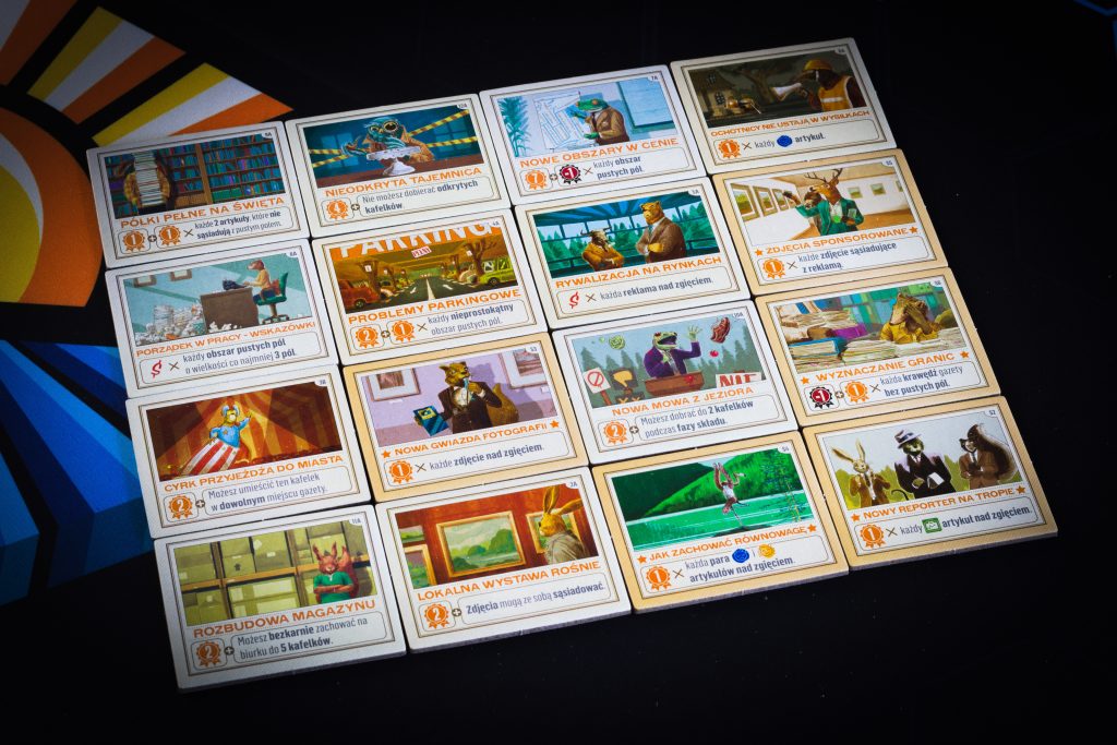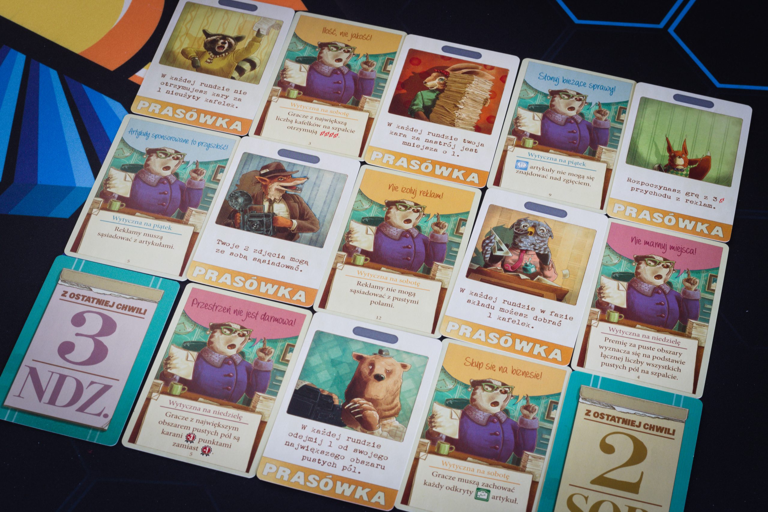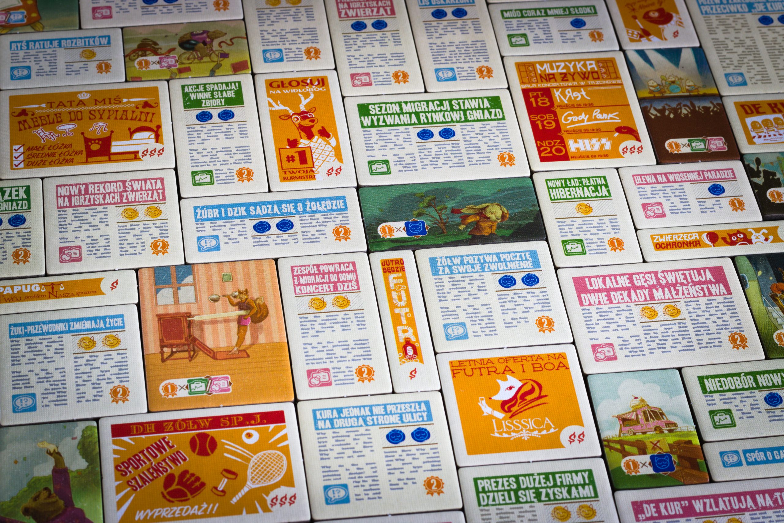Przed sobą mamy planszetkę symbolizującą pierwszą stronę naszej gazety. Obok stolik na którym zbieramy kafelki, czyli materiały z życia leśnego uniwersum. A na środku stos gdzie będziemy ich szukać. Trzy typy kafelków – artykuły, zdjęcia i reklamy, mogą mieć różną wielkość, więc musimy je tak wybrać, by po ułożeniu zmieściły się w wyznaczonej przestrzeni. Najlepiej zostawiając jak najmniej pustych miejsc. Dodatkowo te same rodzaje materiałów nie mogą się ze sobą stykać, ale za to przynoszą punkty spełniając różne warunki sąsiedztwa.